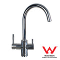 Introducing the Model "Q" 3 Way Goose Neck Mixer Tap, the perfect addition to any kitchen. Enjoy fresh, filtered water along with regular hot and cold tap water - all without sacrificing style. Say goodbye to extra faucets and drilling, as this tap conveniently replaces your existing one. With an electroplated chrome finish and Ceramic Disc Valve technology, it's a durable and elegant upgrade.