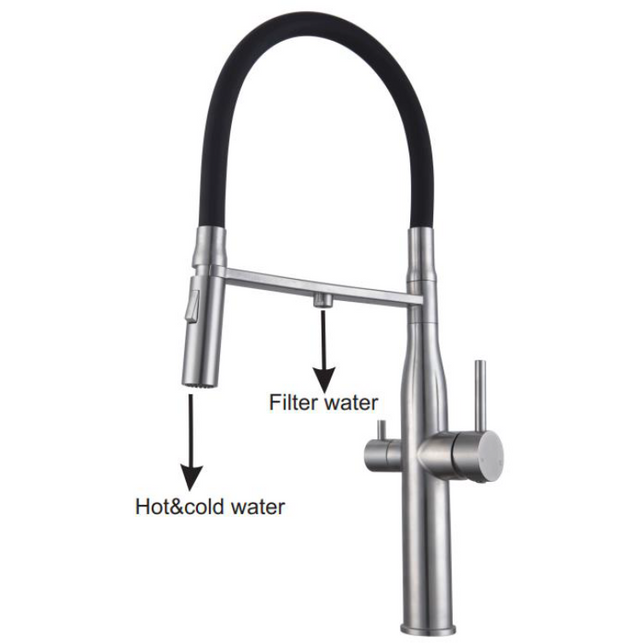 Dual Handles - Hot and Cold water with the big handle and filtered water with the small.