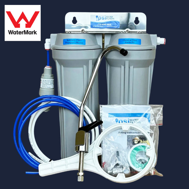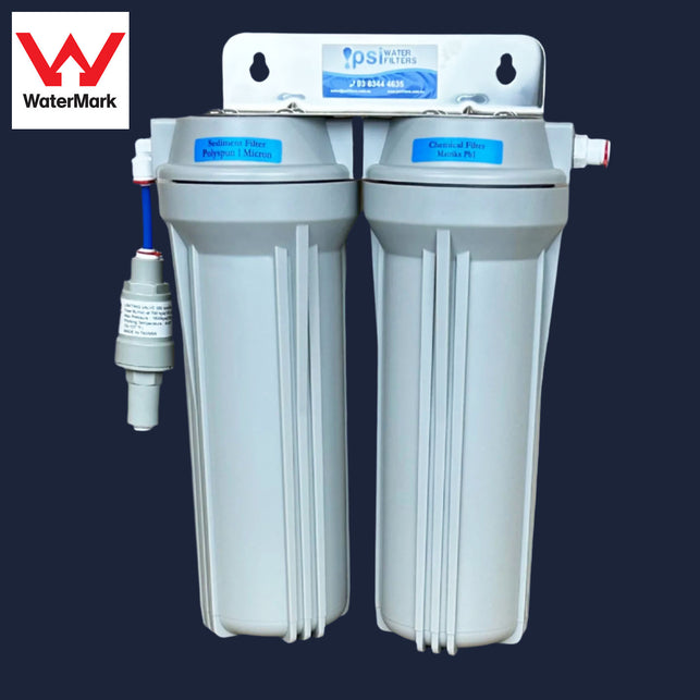 Premium twin under sink system with 1 micron sediment filter & Aragon carbon cartridge.