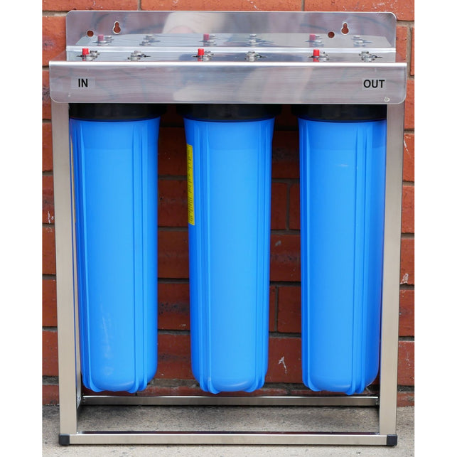 Can be free standing or wall mounted. Generally installed anywhere from the water meter entering the property or where your mains water pipe enters the house. The following system is suitable for medium to larger households. For a small house or unit we recommend a twin whole house system like the WH-002-SS.