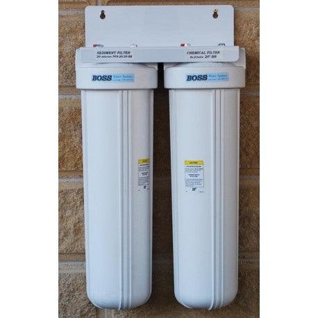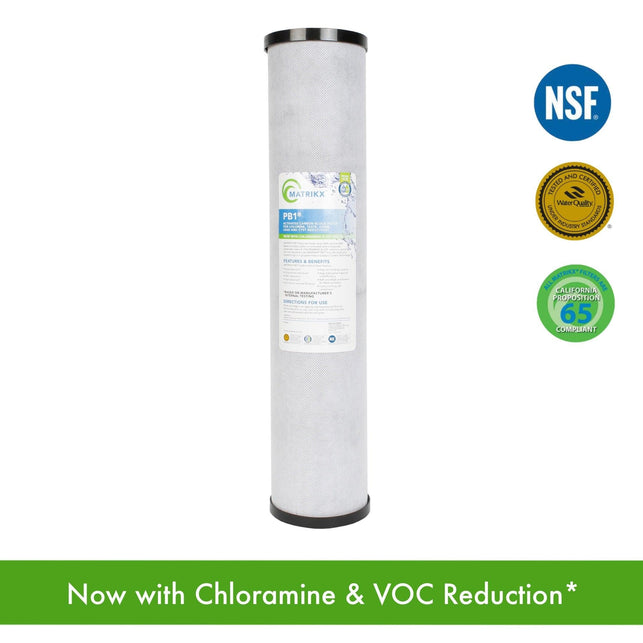 The Wh-002 whole house filter system uses a 20" big white housing with a 1, 5, 10 or 20 micron polyspun sediment filter. The second stage uses a 20" big white housing with a Matrikx pB1 20" x 4.5" extruded carbon cartridge, 0.5 micron Reduction of PFAS, Giardia and cryptosporidium cysts, chlorine treatment for 158,000 litres and lead treatment 64000 litres.
