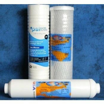 Includes: NSF listed 1 micron polyspun sediment cartridge, Omnipure OMB934-5M extruded carbon block 5 micron cartridge & Omnipure CL10RO-T40 extreme purity GAC coconut carbon post filter cartridge.